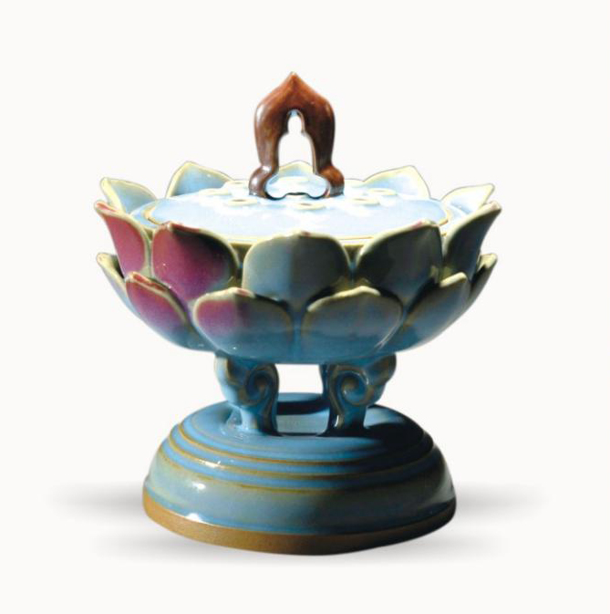 造型为莲花状香薰炉,炉益提钮采用观音造型镂空,素净优美,精美绝伦。炉盖平圆规整,9个圆孔,象征长长久久,炉体如盛开莲花,莲花瓣饱满丰盈,落落大方,匠心独具。炉体由如意足支撑,底部两道弦纹,简洁中富有变化。