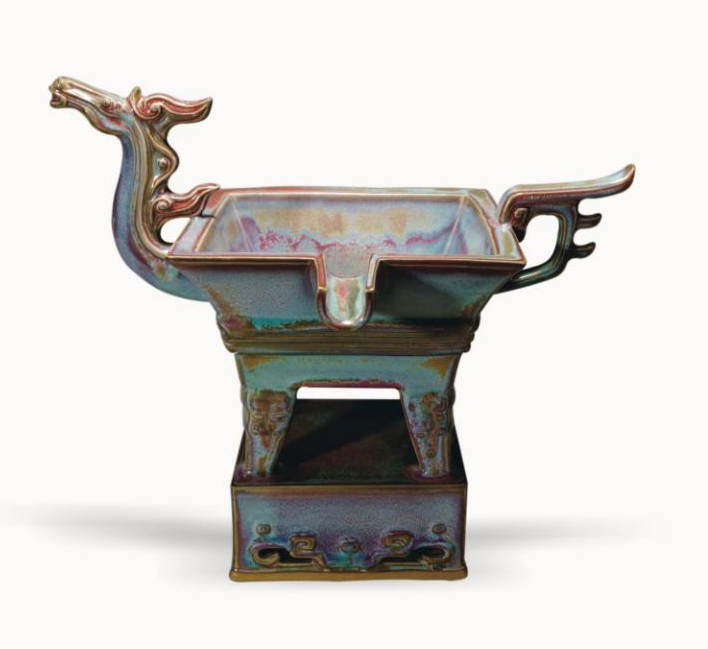的造型,爵亦为礼器,有加官进爵之意,整体造型为一匹仰天飞腾的骏马,底部饰以祥云浮雕,寓意飞黄腾达。作品简洁流畅、充沛饱满,更意味着祝福、安康,幸福远长!