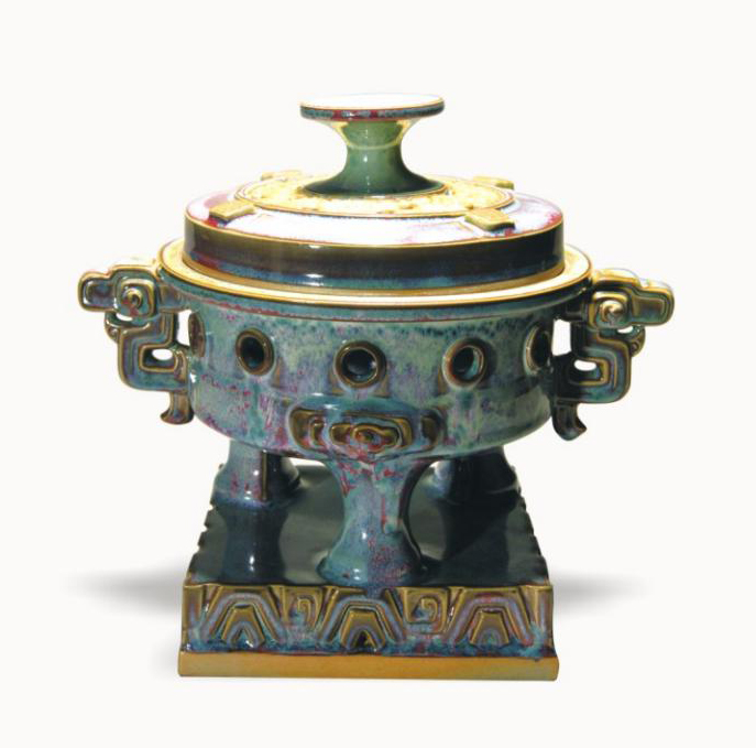 《汇融四海》以中国古老的礼器香炉为基本造型,顶部为镂空祥云纹样,精美典雅