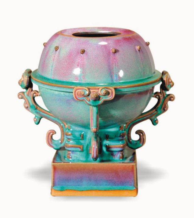 《乾元鼎》以中国古老的浑天仅为创意原型,装饰四个龙形如意云纹,线条简练飘逸,底部采用玉琮的造型,挺拔俊秀,代表着四面八方、天下大平,赋予国礼雍容博大
