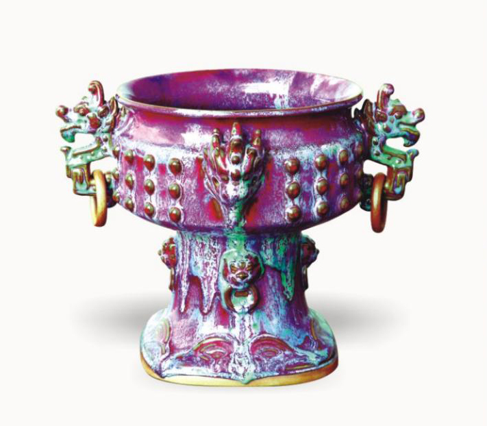 为造型,上部四个龙形浮雕,中部装饰四个虎形铺首。下部的海浪纹,象征着大海波平浪静,点出了作品的主题