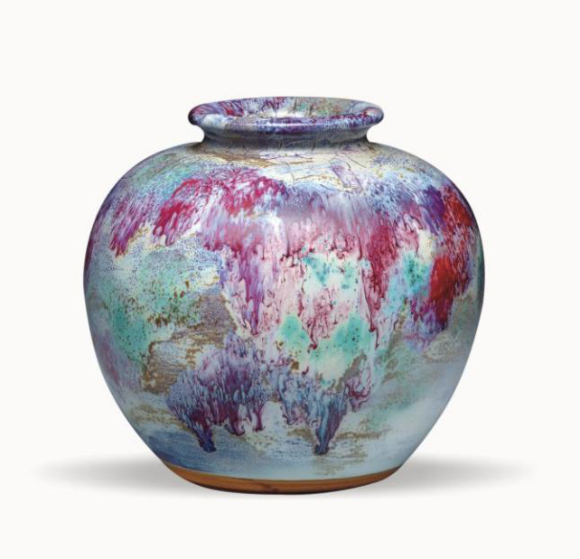 窑变釉色丰富,流动感极佳。把钧瓷五大主色调"红、紫、青、蓝、白"集于一身,过渡色、复合色恰到好处完如一幅锦绣山河图。所言"正红叶漫山,清泉漱石,多少心期。三生溪桥话别,怅薜萝、犹惹翠云衣。此情此景,怎不令人心旷神怡?