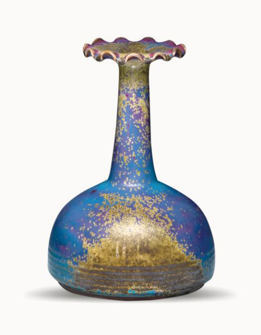 瓶口开放舒展,仿佛平铺在湖面上的荷叶,随风自由摆动,极富韵律美,将钧瓷的流畅优雅之美展现得淋漓尽致。通体以蓝紫色为主调,釉质如玉,点点金斑如星空闪烁很能凸显主人的沉稳,高洁的人格和洒落的胸襟,给人以无尽的遐想。