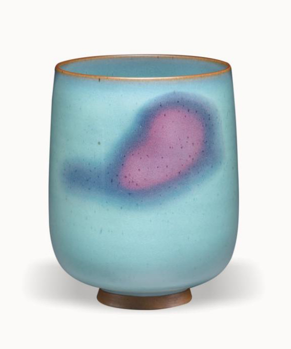 当代仿宋代表,器型为铜口铁足。柴烧工艺烧制而成,其底色为清丽温润的天青色,那一抹紫斑,如祥云案绕的天际。釉色堂润,其色泽泛青,透激晶亮,工艺精美,仿佛能感到清香阵阵,作品反映了对美好事物的追求、对完美的向往。